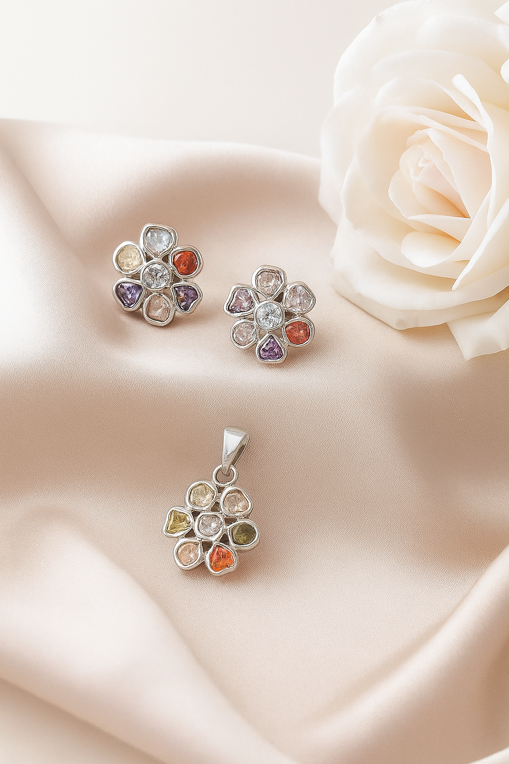Elevate your elegance with the Navaratna (multi colour) pendent set, expertly crafted to symbolize balance and positive energy. This pendant features the nine precious gemstones, each chosen for their traditional significance and harmonious alignment. Ideal for those who appreciate both timeless beauty and spiritual symbolism, this set offers a refined touch to any attire, enhancing both style and well-being. Perfect for everyday wear or special occasions, it combines artistry and meaning in a beautifully designed accessory.
